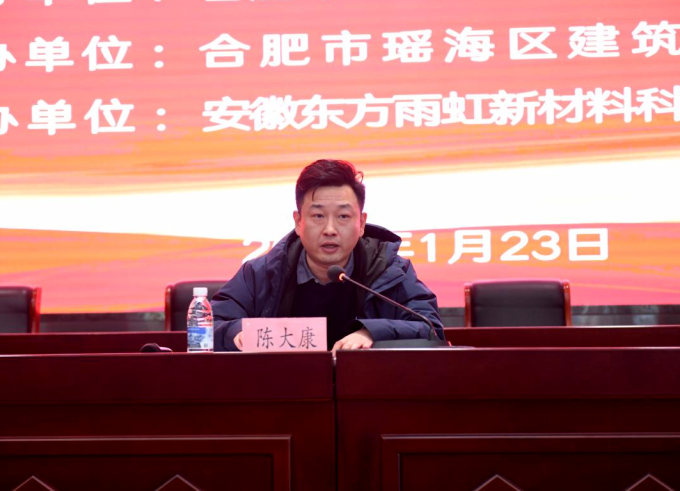 1月23日下午,由合肥市瑶海区住建局主办、瑶海区建筑行业协会承办,中铁四局集团第四工程有限公司、安徽东方雨虹新材料科技有限公司协办的《建筑与市政工程防水通用规范》(GB 55030-2022)宣贯培训暨绿色建材生产企业推介会在中铁大厦二楼报告厅圆满落幕。本次会议汇聚全区60余家绿色建材类生产施工企业的近百位代表参会,瑶海区住建局副局长、协会党委书记陈大康,区住建局建管科科长、协会党委副书记许肄,区住建局质安站王祖斌、第一专委会主任李希晨等参加推介会。