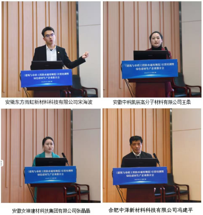 为推动绿色建材产业交流合作、协同发展,会议特别设置绿色建材生产企业推介环节,协会邀请了瑶海区内四家优秀的绿色建材生产企业分别展示各自在新材料、新技术研发应用上的最新成果。安徽中科凯辰高分子材料有限公司王柔、安徽女神建材科技集团有限公司张晶晶、安徽东方雨虹新材料科技有限公司宋海波、中泽新材料科技有限公司冯建平等四家专业防水建材科技企业代表依次详细介绍了各自企业核心绿色防水建材产品的技术优势、应用场景及环保特性,搭建起供需双方精准对接的高效平台,助力绿色防水建材在瑶海区建设工程中广泛应用。